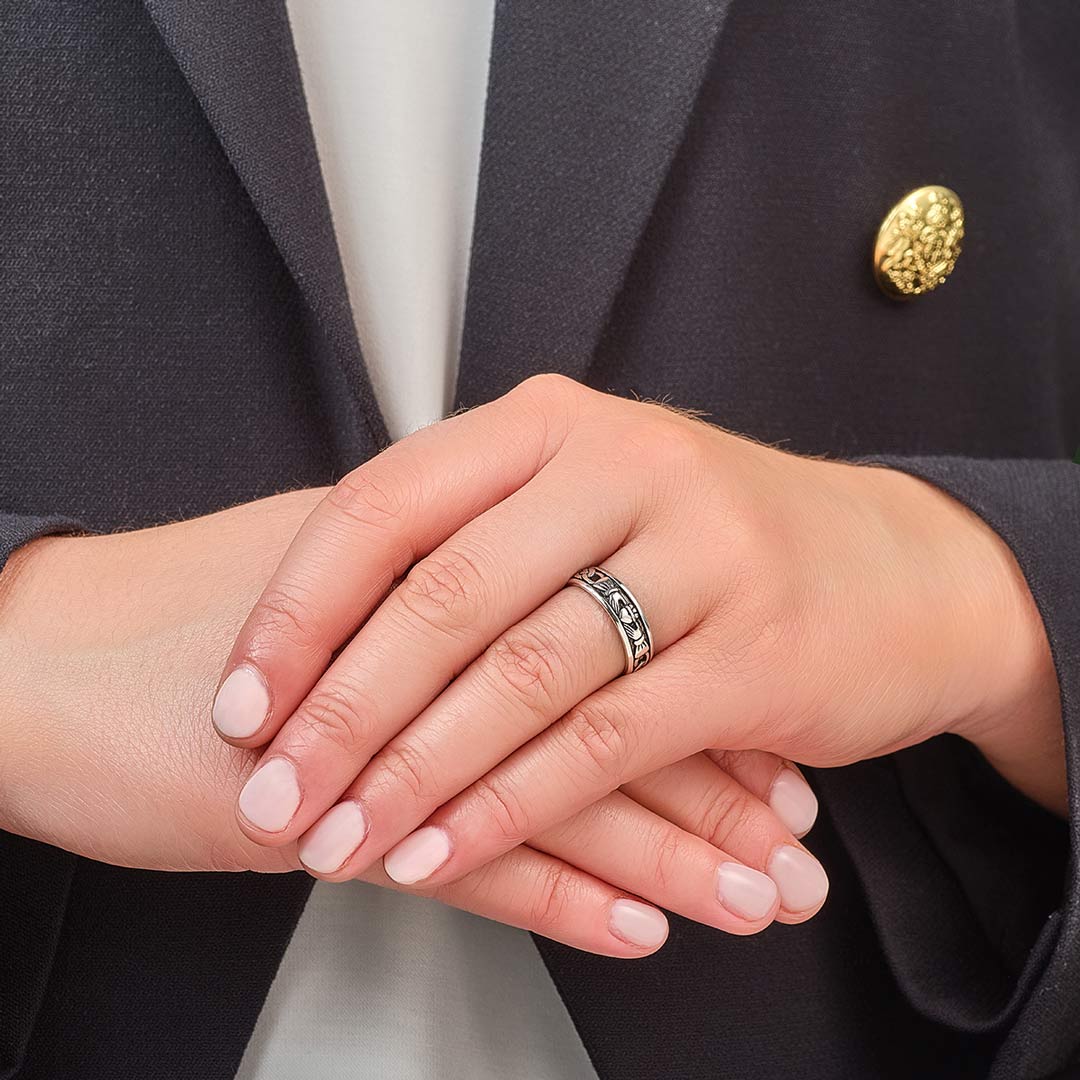 This ladies' Celtic Claddagh ring features traditional knotwork and Irish Claddagh symbol of love. The Claddagh symbol is a cherished and meaningful choice for jewellery, serving as a heartfelt representation of love, friendship, and loyalty. The Claddagh band has a tarnished appearance due to oxidisation, giving the ring a timeless look. It is perfectly normal if the actual colour of the oxidised part of the ring may vary slightly from the one shown in our images. This Claddagh ring has been Irish hallmarked in Dublin Castle. There is a matching Claddagh ring for gentlemen available.