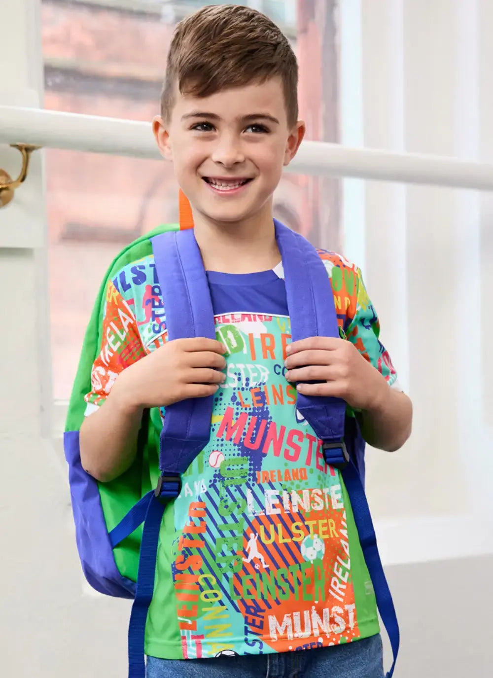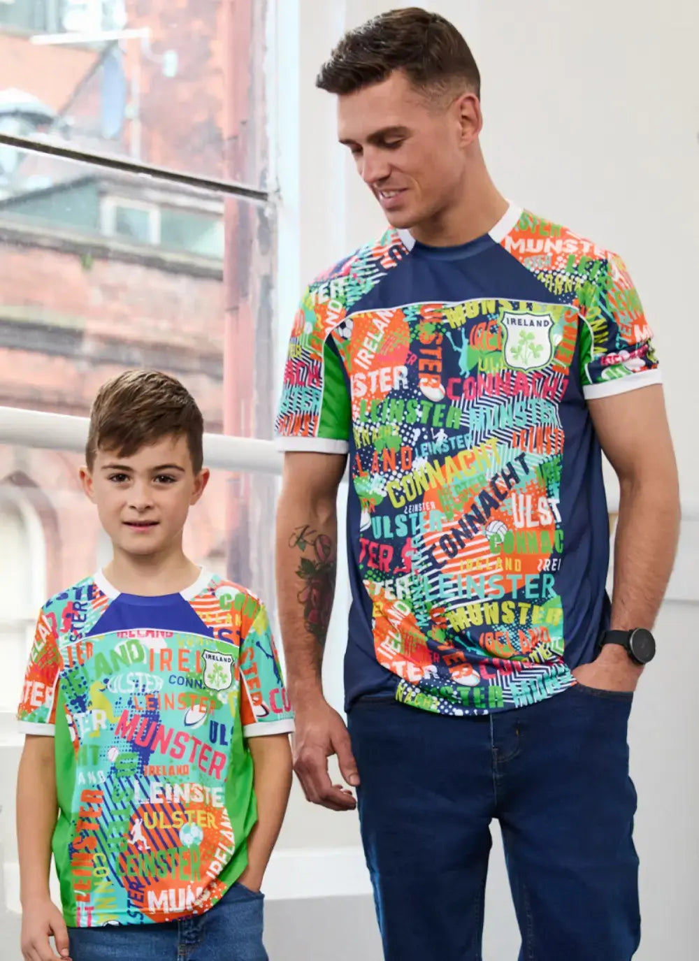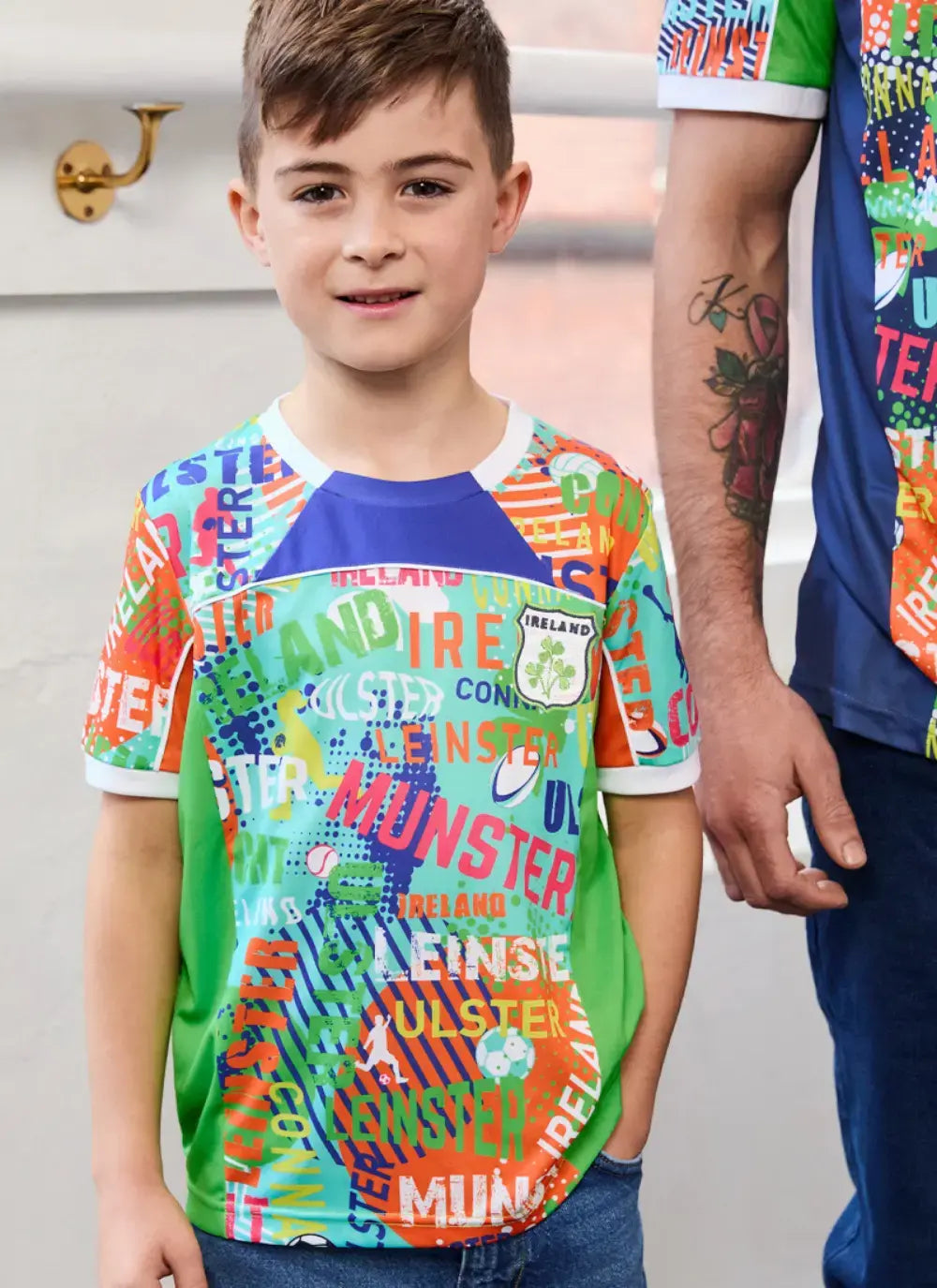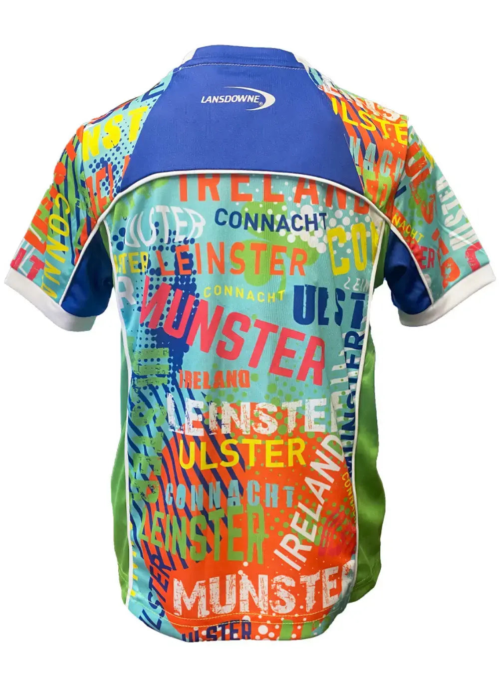 Our Lansdowne Kids Ireland 4 Provence Sports Top is a vibrant and colorful sports jersey featuring the names of the four Irish provinces: Connacht, Leinster, Munster, and Ulster, in various bold fonts and colors. The top also includes an Ireland crest with shamrocks on the chest, adding a nationalistic touch to the dynamic design.