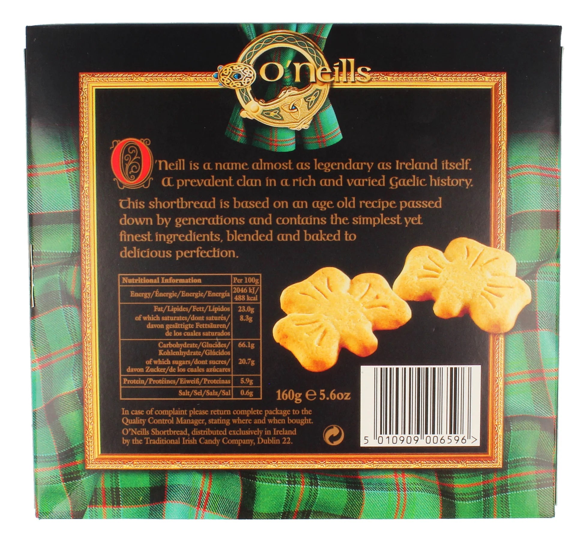 The name O'Neill harks back to an ancient and noble Gaelic family lineage rich with history and tradition. The recipe for this shortbread is based on an old tradition which expertly blends high quality and simple ingredients. The buttery flavour melts in your mouth and the shape makes them a charming gift. Please note: These cookies have a European expiration date with the day appearing first followed by the month and then the year.