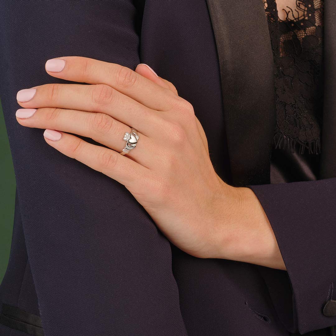 This elegant sterling silver ring for women features the iconic Claddagh symbol evoking love, loyalty and friendship. The Claddagh represents devotion, and echoes the words of the Irish sailor who first crafted it for his sweetheart: “With these hands I give you my heart, and I crown it with my love”. This sterling silver ring has been Irish hallmarked in Dublin Castle.