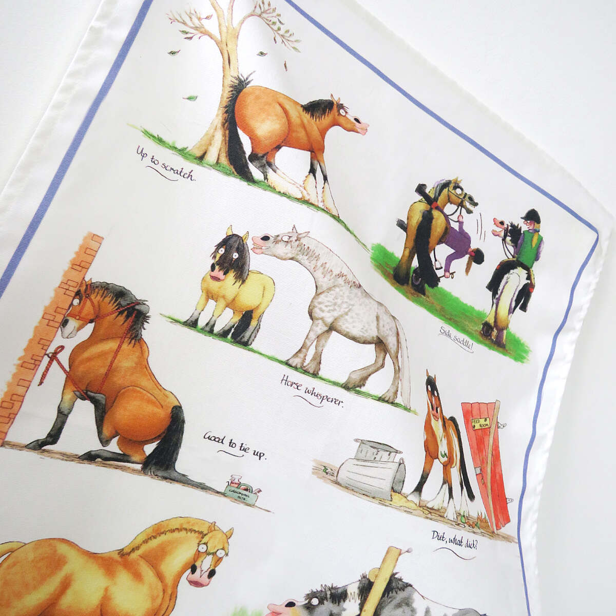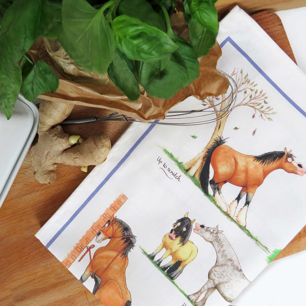 Our in-house Grass is Always Greener tea towel featuring a variety of playful horse illustrations, with a humorous spin. Manufactured of 100% cotton, with easy hang loop this tea towel can be hung up in your home or stables for a truly countryside touch. A great gift idea for any horse lover!